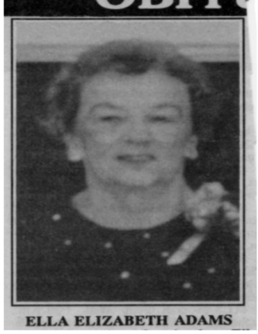 Ella Elizabeth Adams – Funeral services for the late Ella Elizabeth Adams, 81, of Cape George, took place December 20, in St. James united Church, with MacRoberts officiating. Burial was in St. David’s United Church Cemetery, Cape George.