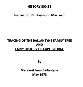 This is a paper written by Margaret Jean Ballantyne in 1973 for a history class she was taking. To read the entire paper, please download the attached .pdf document.