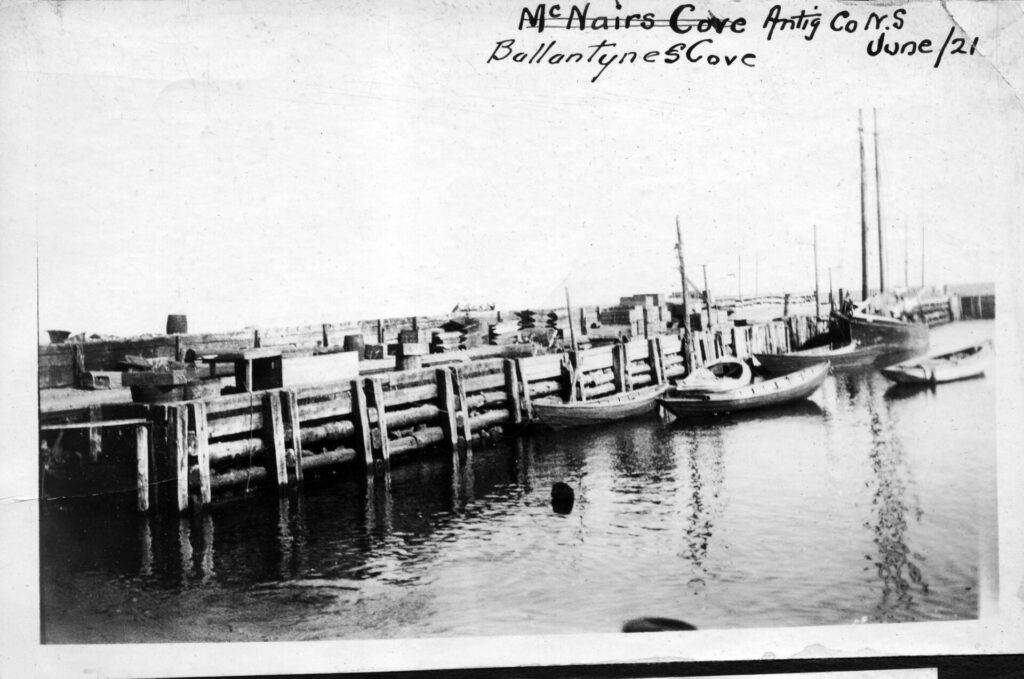 Ballantynes Cove wharf with fishing boats tied up along wharf. Photo was included in a package with other pictures taken in 1928. It is interesting to see that originally it was labeled as “McNairs Cove”. This was the name of the cove prior to it being changed to Ballantynes Cove.