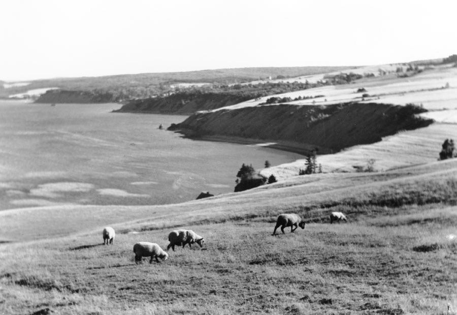 From Cape George Point overlooking Ballantynes Cove. Sheep grazing.
