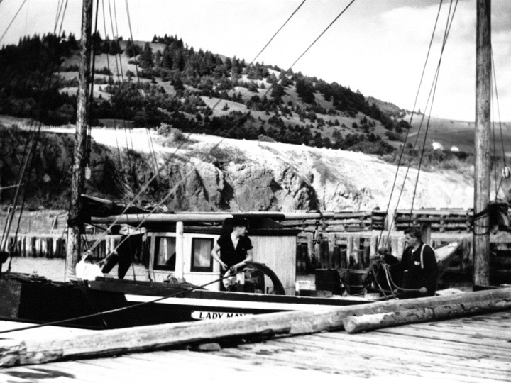 From wharf at Ballantynes Cove, showing sailing fishing boat with a male on board. Boat named the “Lady ??”