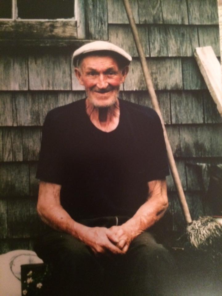 Seated portrait photo of Dougald MacEachern sitting down in front of his shack at the wharf. Taken by a CBC reporter.