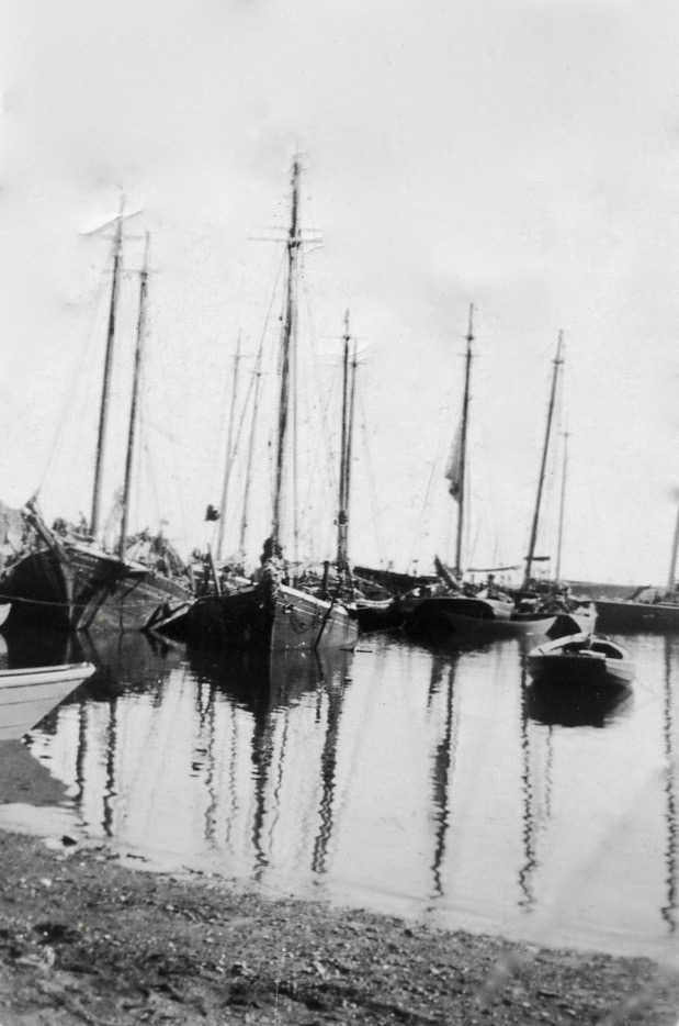 Old photo of gravel ships in along shore. They used to come in and be loaded with gravel from the beach and sailed away. The Gravel ships came from P.E.I They were also loaded by docking at the outer end of the wharf and where the gravel was brought to them by horse drawn dump-carts.Israel Robert and David MacDonald (Old Davie, as we called him) built a track similar to rail tracks from the beach to the end of the wharf, fitted with boxcars also to load the vessels