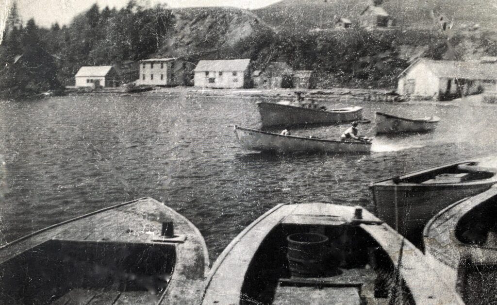 Old damaged black and white photo of Ballantynes Cove. Shows the harbor buildings in the back and even Dougalds shack.