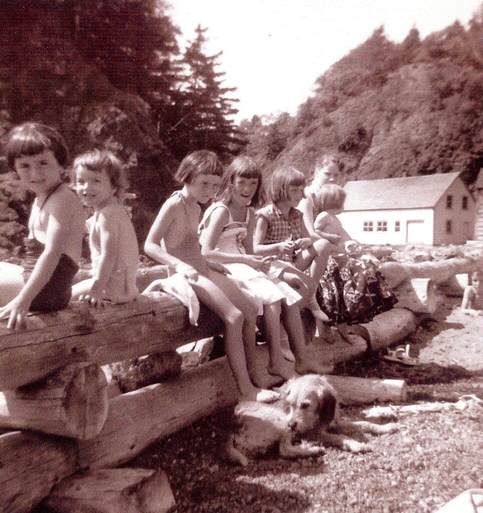 Photo of kids sitting on wood at Ballantynes Cove near the old wharf beach. (L to R) Mary Alice MacEachern, Susan MacEachern, Gladys MacPhie, Meachie Leudy, Kathleen Falkenham/Rideout, Heather MacEachern