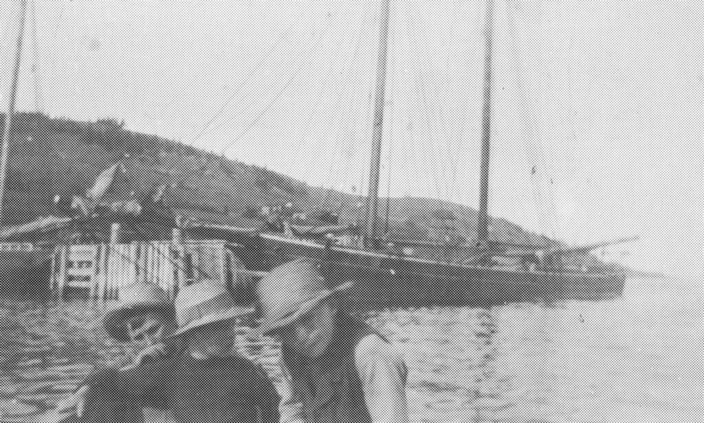 Poor quality photo of three boys on a boat with the Ballantynes Cove wharf in the background.