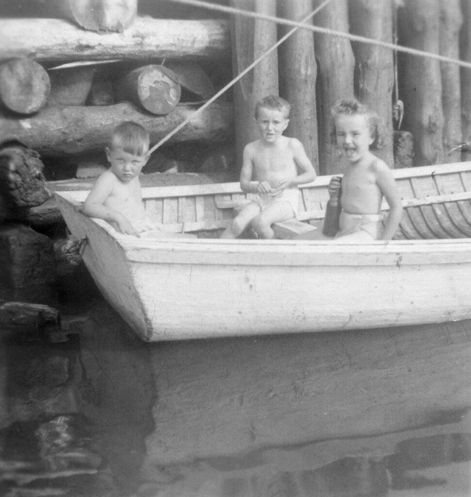 Three little kids in a boat at the wharf. Alvin, Joe and Gail MacEachern.