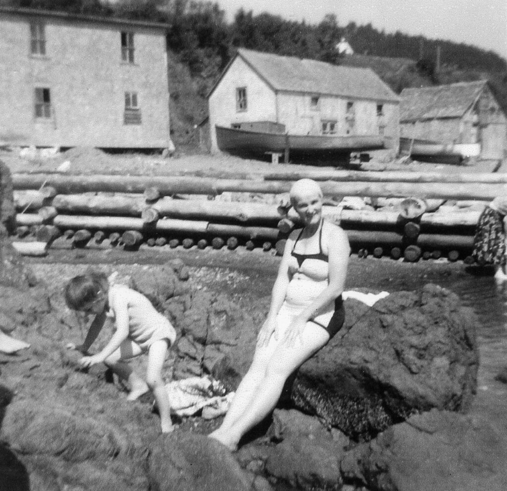 Woman and a child on the rocks at the Ballantynes Cove beach. Woman is Isabel MacEachern and the child is Mary Alice MacEachern. The plant cookhouse/women’s quarters and office and mens quarters in the background.