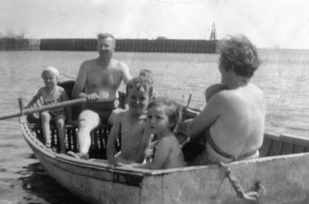 Couple and five kids in a dory at the cove. Couple is Cyril and Iola MacEachern. Three of the kids are Gail (swim cap), Joe and Heather MacEachern.