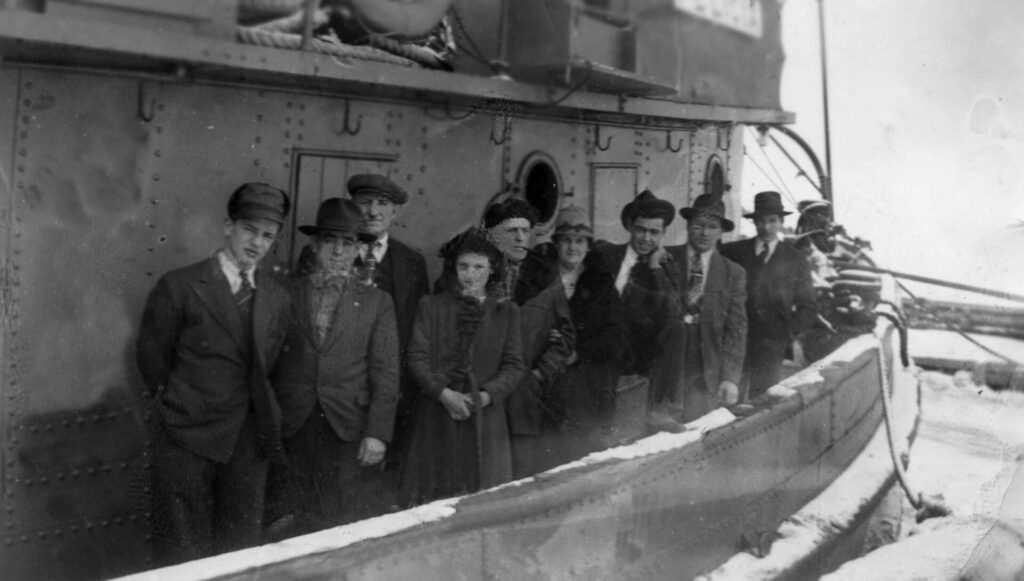 Crew aboard the tug Felicia at Ballantynes Cove. Tug was from Quebec. Rene Michaud – Chief, Mr. Tremblay (mate), Gisile Michaud, Captain Tremblay, Mrs. Tremblay, Paul Baldue, Robert Blaplane, Armand Tremblay. February 23, 1942. Left Ballantynes Cove on February 24th.