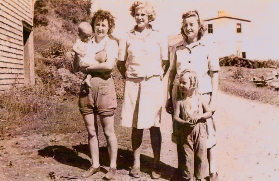 Bea and Ann MacInnis with members of the Roberts family. 1944. Down near the wharf.