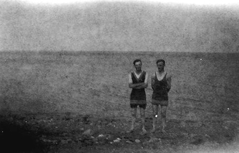 Two men in swim costumes at the beach. Men are Dan Hugh and Colie MacInnis – 1932