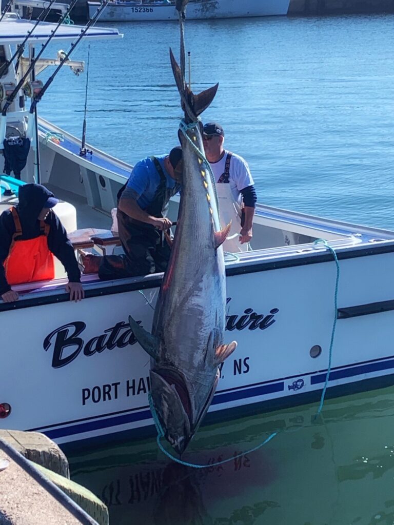 Dustin MacInnnis and large tuna off the back of the boat at Ballantynes Cove wharf. Nephew Will MacInnis on the left and Bert Bertrand on the right. (2019-2020)