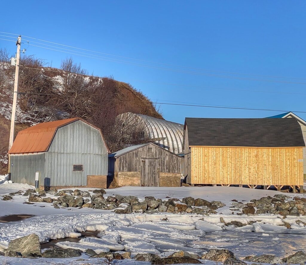 Fishing sheds at Ballantynes Cove. The shed on the far right and in the middle belonged to Kimball Falkenham. The big shed has a new side on it thanks to Kimball’s grandson’s Allan and Michael.