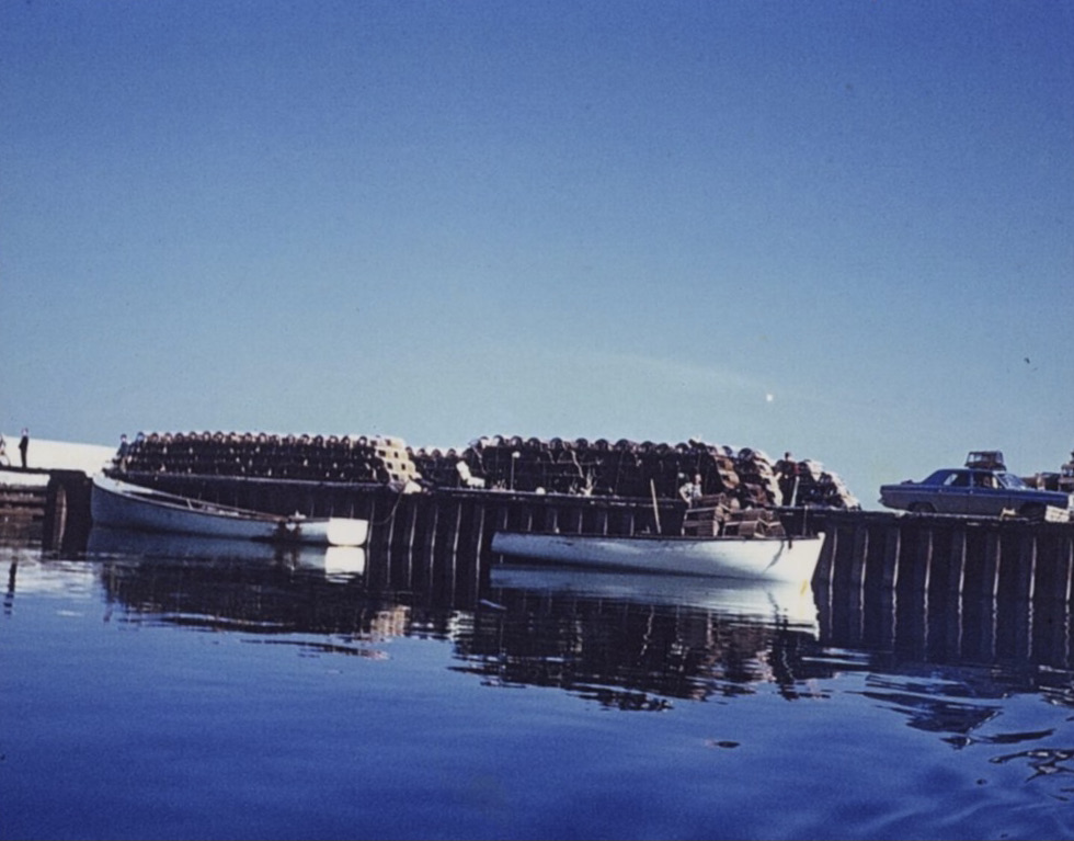 Fishing boats tied up at Ballantyne’s Cove wharf. Lobster traps on wharf. Not sure if it’s before or after fishing season.