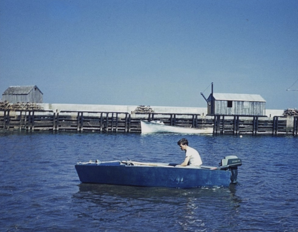 Small boat being operated by Billy MacGillivray (relative of the Shoemaker), in Ballantyne’s Cove. Taken in the 1960’s the wharf behind shows the weigh shed for the lobsters being brought in. To the left is the fishing shed of Mark MacInnis.