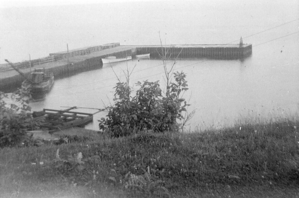 Early photo of the wharf at Ballantynes Cove. There is a dredger in the harbor. Prior to any major improvements to wharf, or breakwater being added.