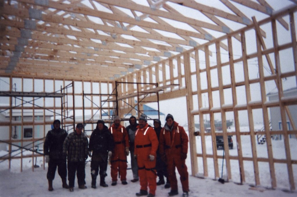 Men in building being constructed at wharf. Now the first building on the left when you turn into the wharf area. (L to R). Unknown, Tommy MacEachern, Carroll Brown, Unknown, Donald Haskett, Unknown, Unknown, Pat MacDonald.