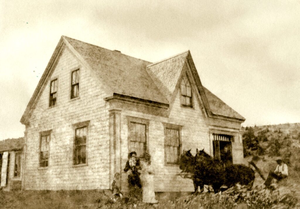 Early photo of the Ballantyne House. A couple people out front but too unclear to identify.