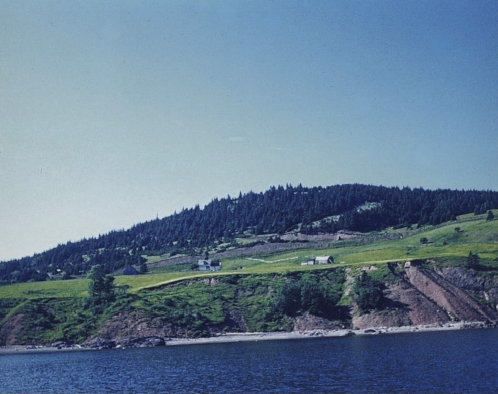 From a boat along the shoreline – looking up at Charlie Willie’s property including house and barns.