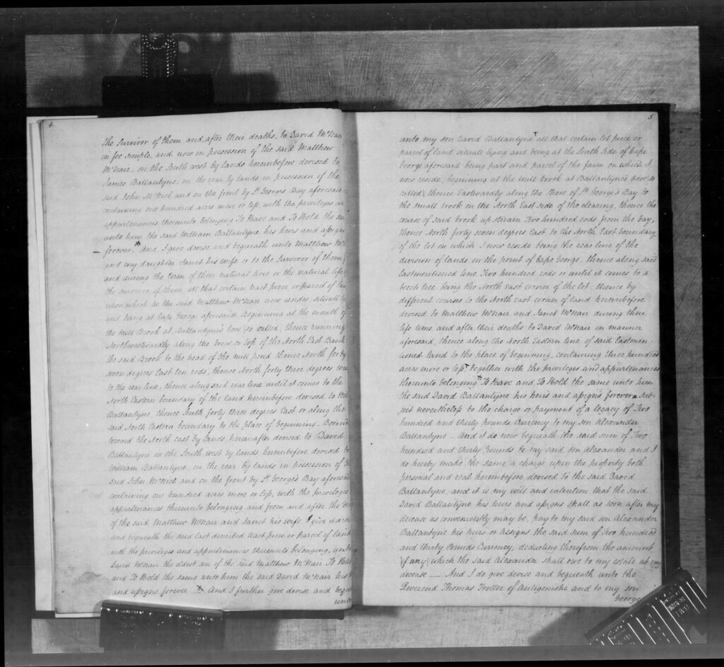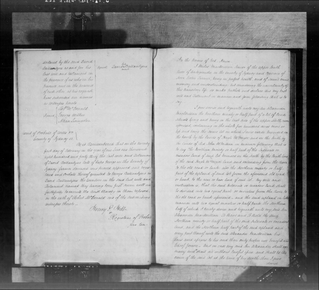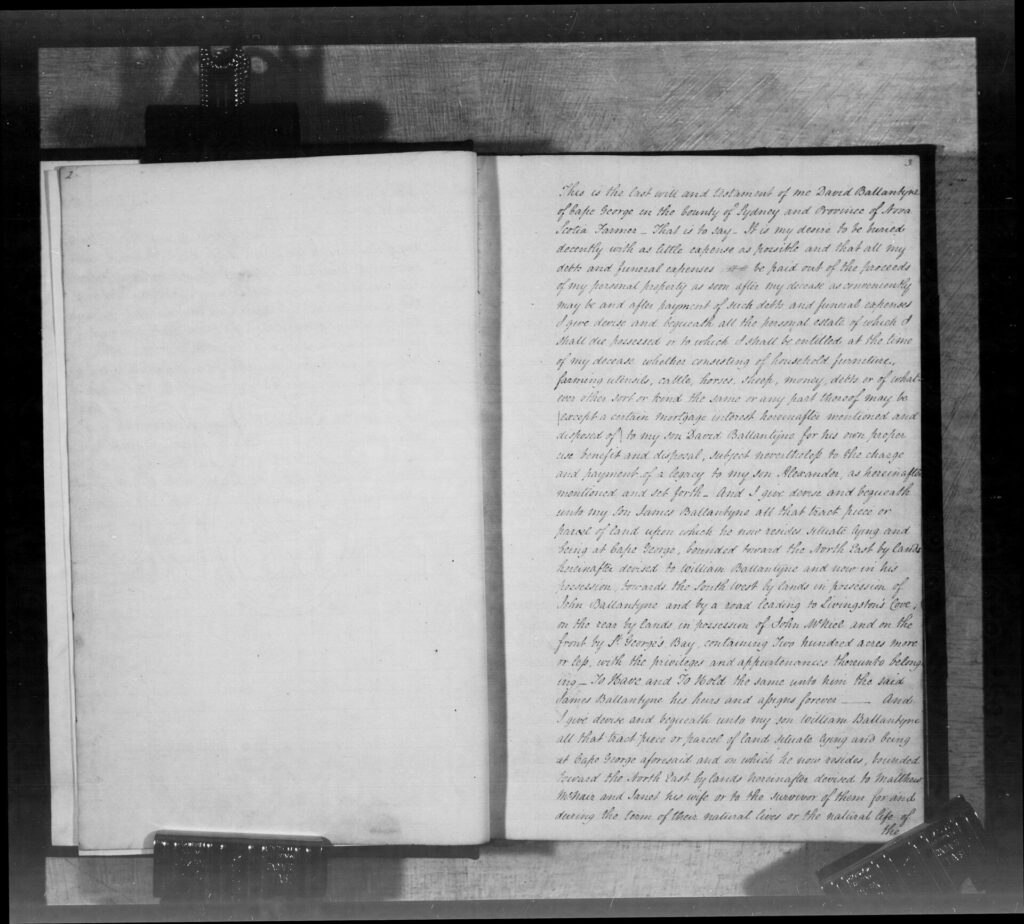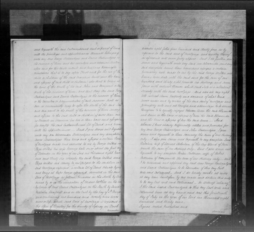 Will and Probate of David Ballantyne (1760-1843), of Cape George. Will was dated 14 Jul 1839 and the Probate dated 21 Feb 1843. He leaves his vast property holdings to his children David, Alexander, James, William, Janet McNair, George, Anne, Thomas, Margaret Small, Jane Robertson and Helen Patterson. He also mentions his grandson David McNair and Rev. Thomas Trotter, which ensures land is set aside for the use of the Presbyterian Church. He also wills a mortgage and debt owed him to two of his children.
