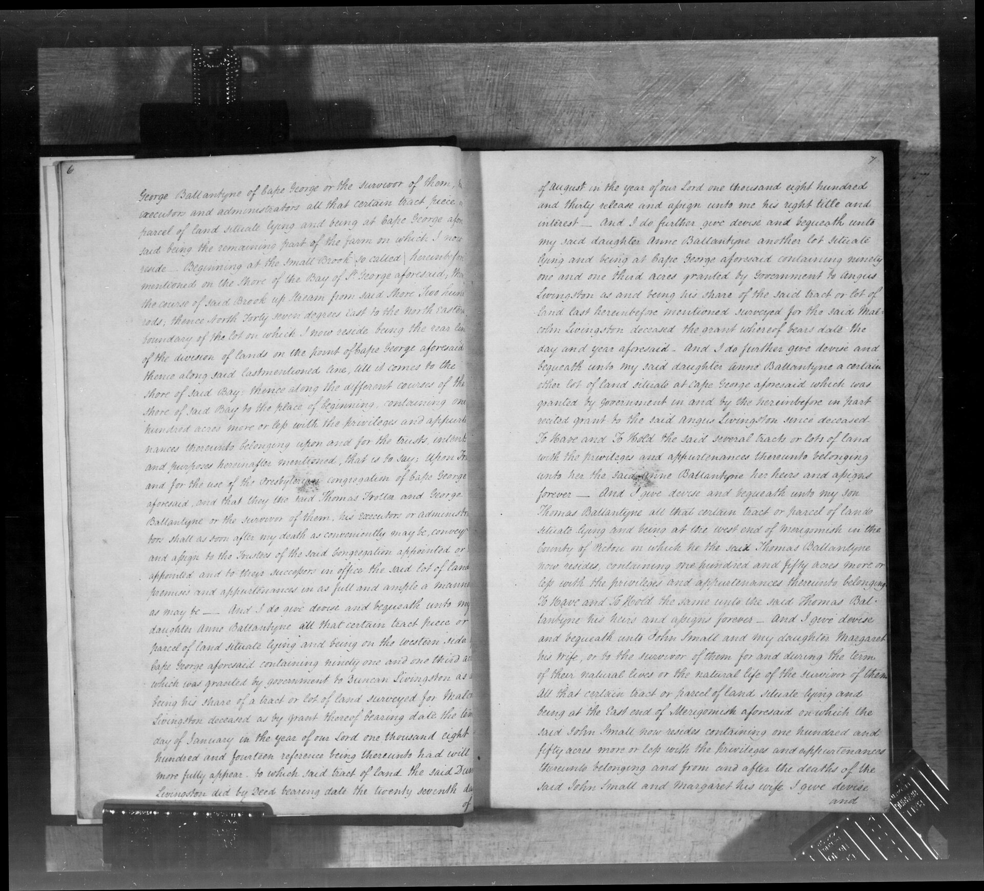 Will and Probate of David Ballantyne (1760-1843), of Cape George. Will was dated 14 Jul 1839 and the Probate dated 21 Feb 1843. He leaves his vast property holdings to his children David, Alexander, James, William, Janet McNair, George, Anne, Thomas, Margaret Small, Jane Robertson and Helen Patterson. He also mentions his grandson David McNair and Rev. Thomas Trotter, which ensures land is set aside for the use of the Presbyterian Church. He also wills a mortgage and debt owed him to two of his children.
