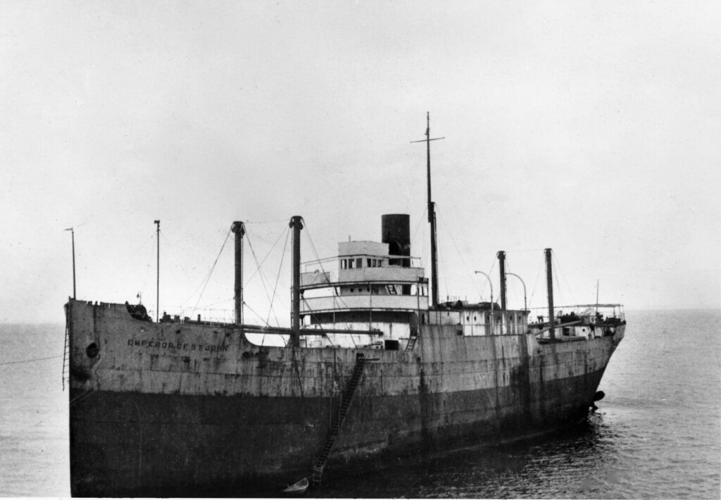 Emperor St. John – side view of ship with stairs lowered down to water and a small boat docked.
