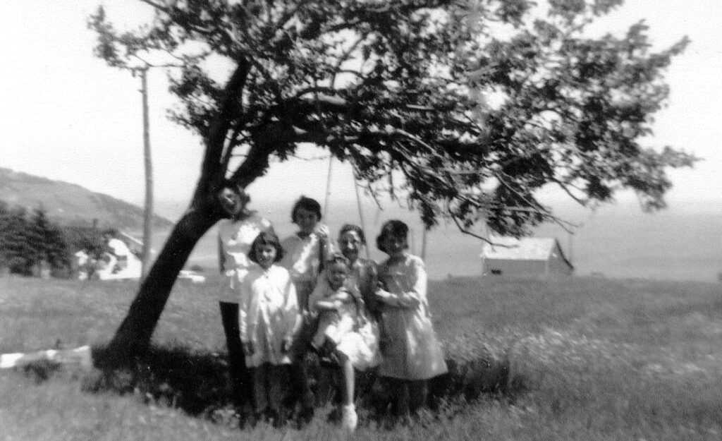 Five kids under a tree with a woman. (L to R) Gail, Connie, Mary Alice, Aunt Hortence and Greg MacEachern.