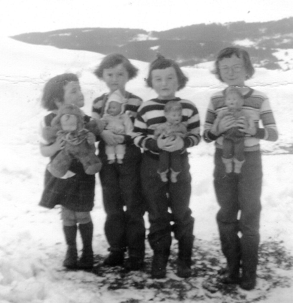Four little girls with their dolls (winter) (L to R) Gail, Connie, Heather, Susie MacEachern.