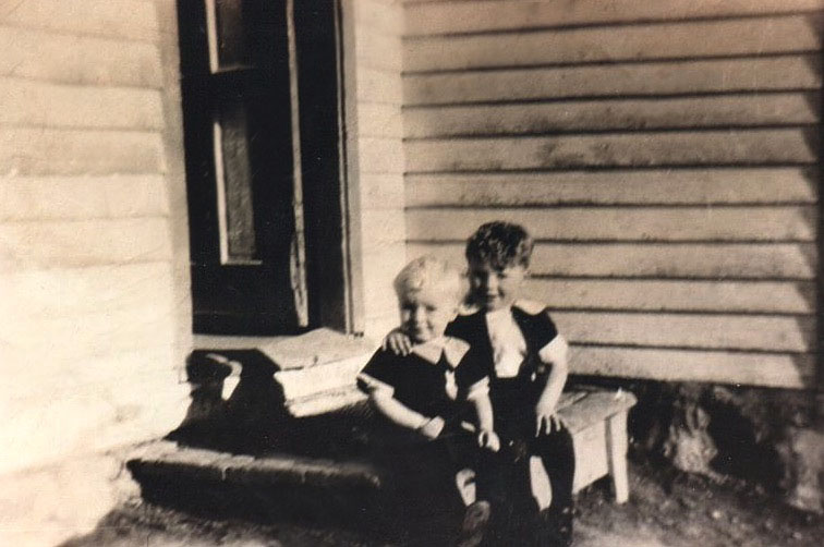 Brothers Colie and Dan Hugh MacInnis sitting on step of old kitchen at cape house. 1907