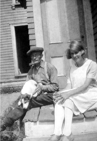Girl and an older man on a porch. Man has a dog on lap. Patricia Dawe/MacInnis with her grandfather “Bergie”. c.1926