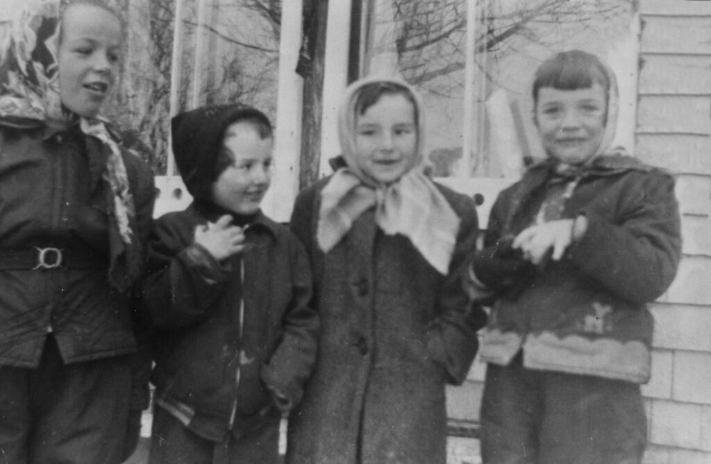 Group of four little girls in winter coats. Anne MacPhie, Connie MacEachern, Gail MacEachern, Gladys MacPhie.