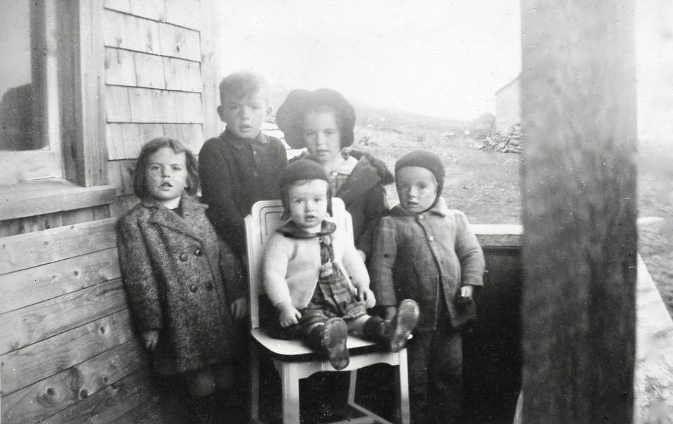Children on front porch of house. Pre-1950’s. MacEachern Kids (L to R) Eva, Albert R, Catherine, Margaret, and Ross sitting in chair. Children of Ruth and Alex R. MacEachern.