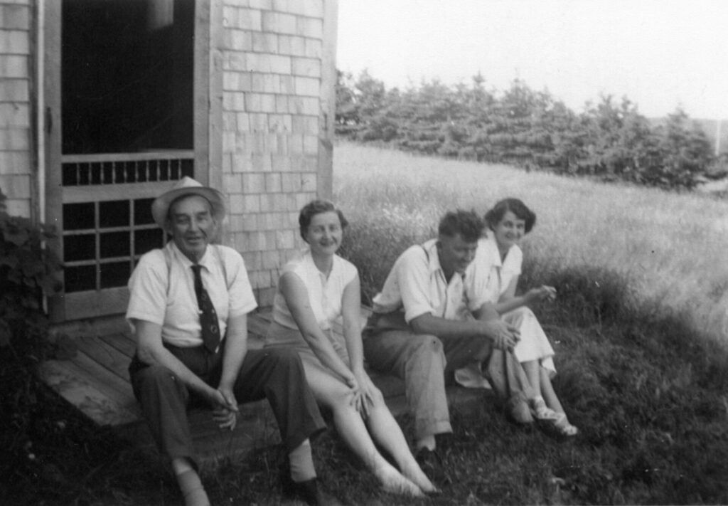 Group sitting on the stoop of a house. (L to R). Jim Ranald MacEachern, Leona Roberts, Austin and Joyce MacEachern.