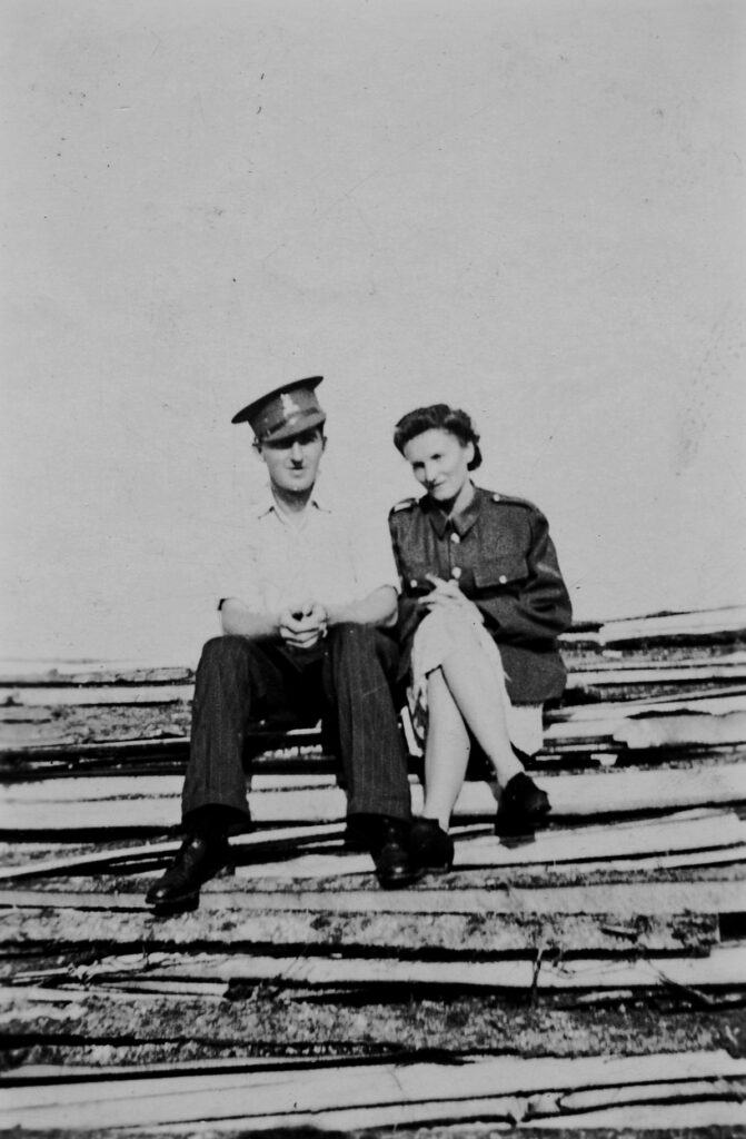 Morrison MacEachern and Isabel wearing his uniform jacket, sitting on a pile of lumber.