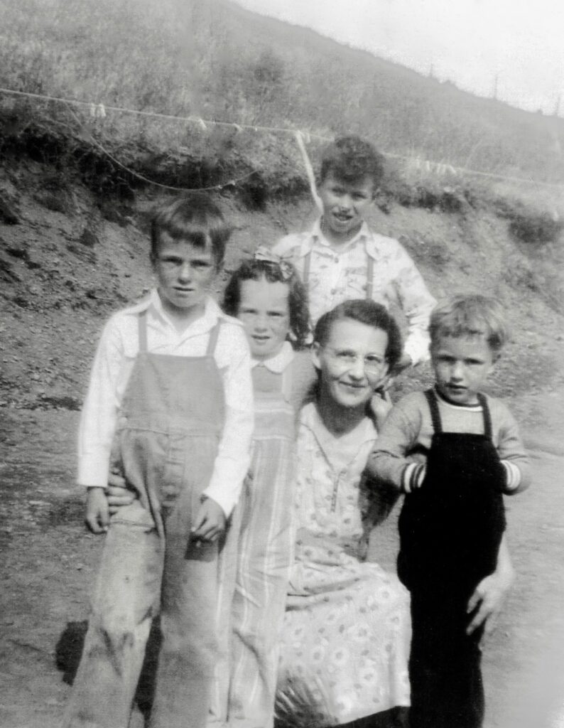 Ruth MacEachern with kids Tommy (dark coveralls) Louie (standing on left) Albert behind and Margaret (Girlena).