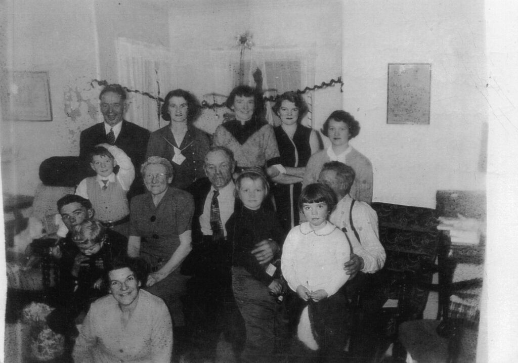 Large group in livingroom of house. Christmas time. Back row (L to R). Harold MacPhie, Louise MacPhie, Betty Ann Ballantyne, Dotty MacPhie, Janet MacPhie. Second row (L to R) Billy and Mabel MacPhie, Anthony MacDonald, Anne sitting on his knee, John M., Lennie and Peggy MacPhie.