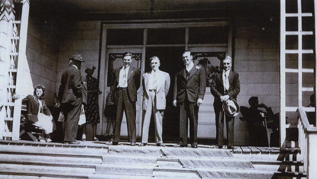 Mark and Isabelle MacInnis’s wedding reception at the Royal George Hotel in Antigonish. (August 1949)The four men are MacInnis brothers – Mark, John, Alex and Bill.