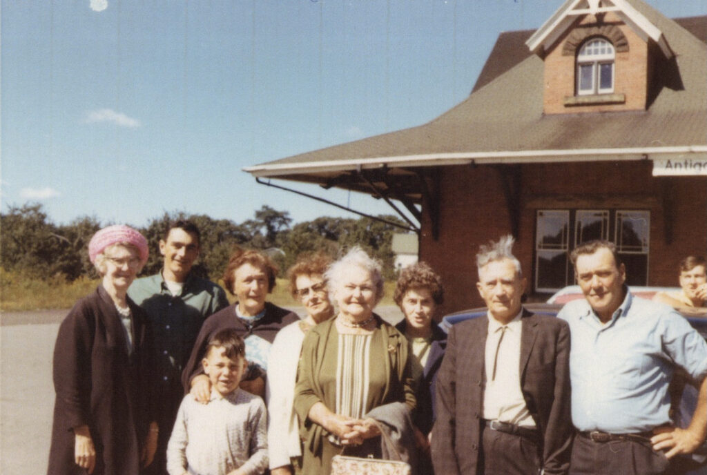 Antigonish train station. August 1969. Blenda MacInnis, Johnny MacGillivray, Esta Magillivray, Margaret Boyd (Peg), Hilda Boyd, Isabel MacInnis, Alex and Mark MacInnis with Hughie MacInnis in the background. The child may be Leroy MacInnis.