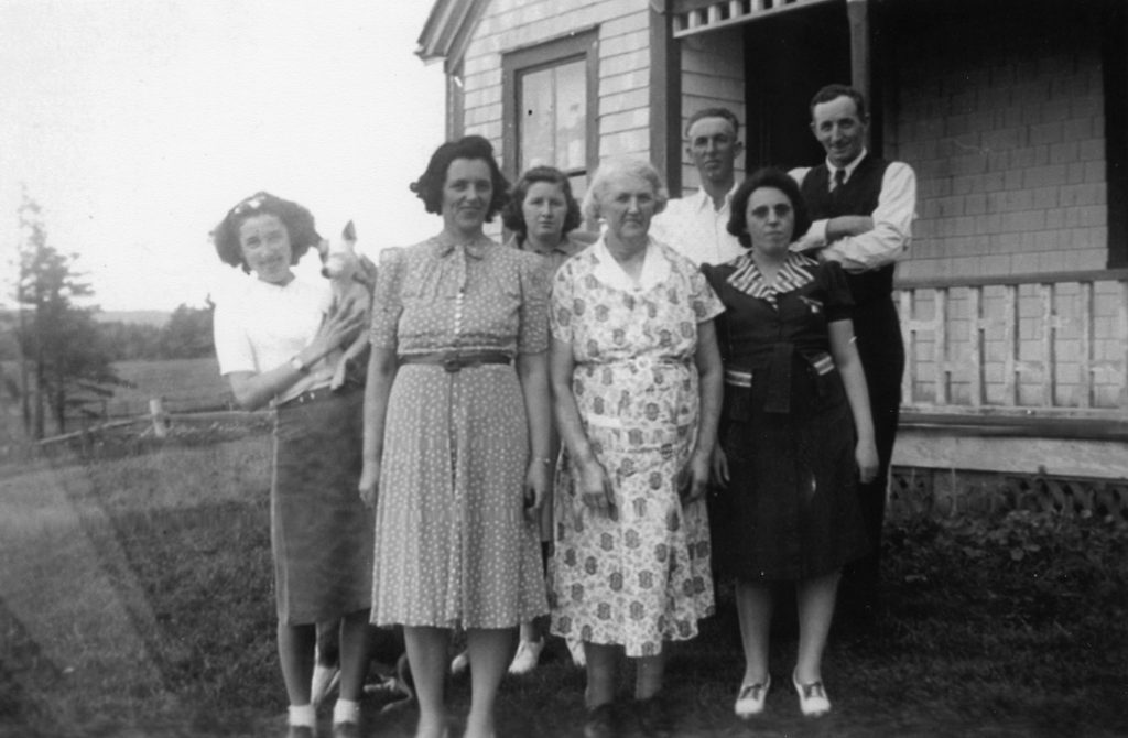 Group in front of a house – not sure order is correct. Mary C, John D, Angus L. Gillis, Catherine Gillis (Brown), Gramma Brown, Margaret Brown, Margaret Sullivan (teacher) on left with dog.