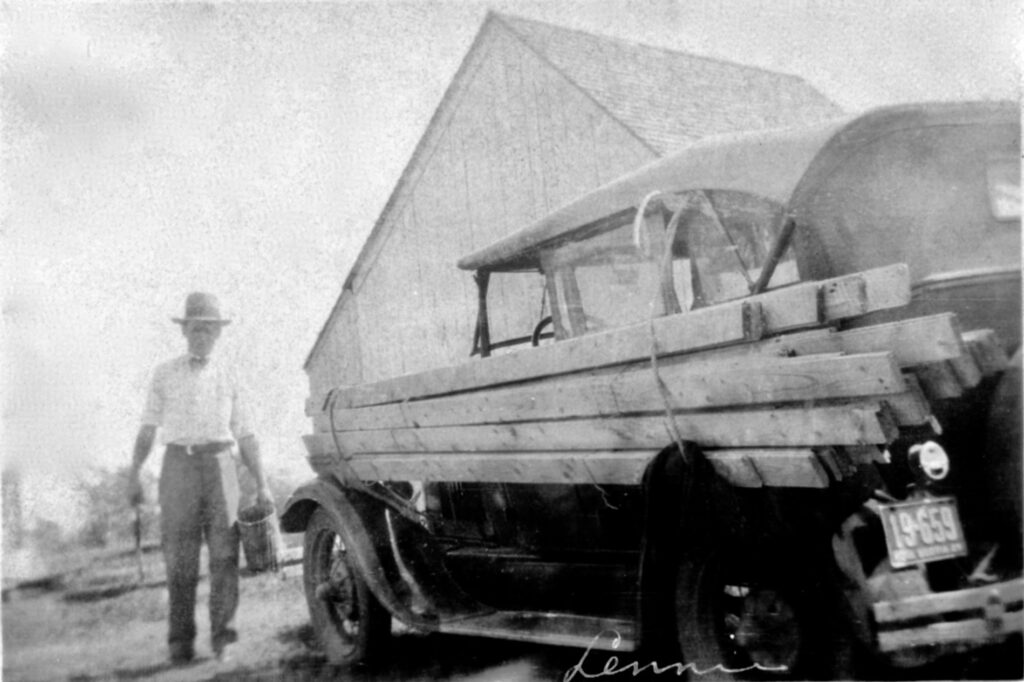 Photo of man walking with bucket in hand by car. Car has lumber all strapped to side.