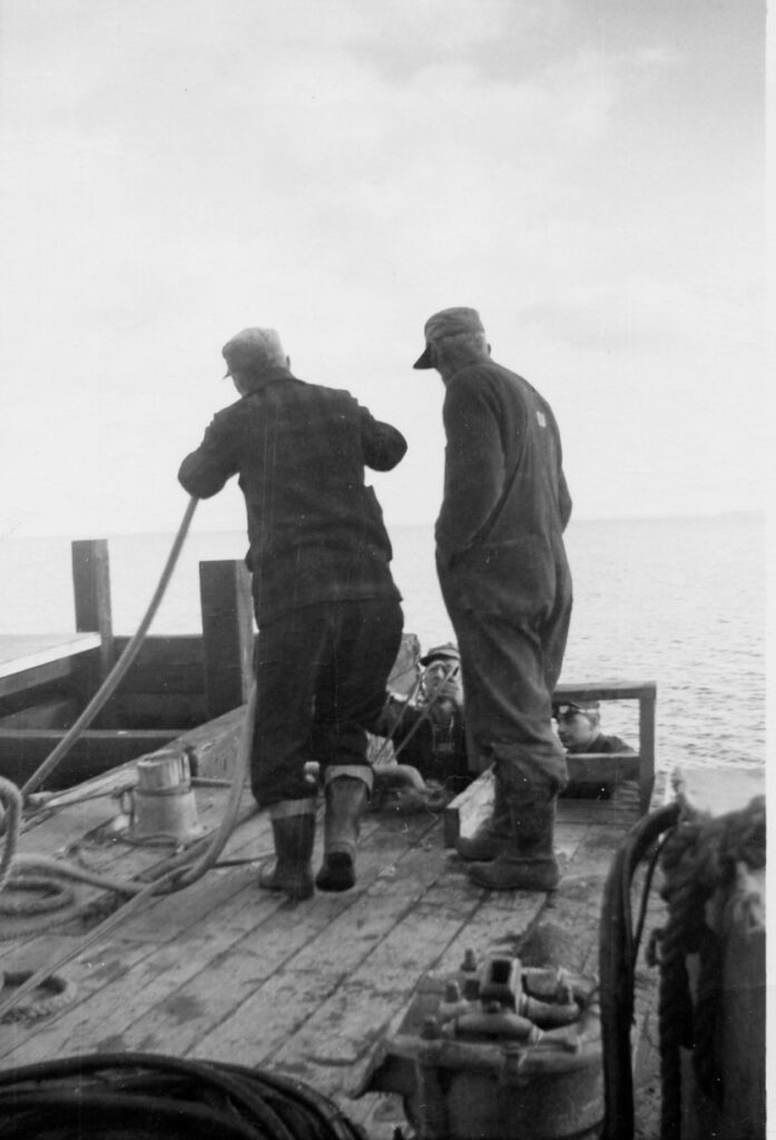Photo of Hugh MacDonald and Alec MacEachern working on wharf. 1956