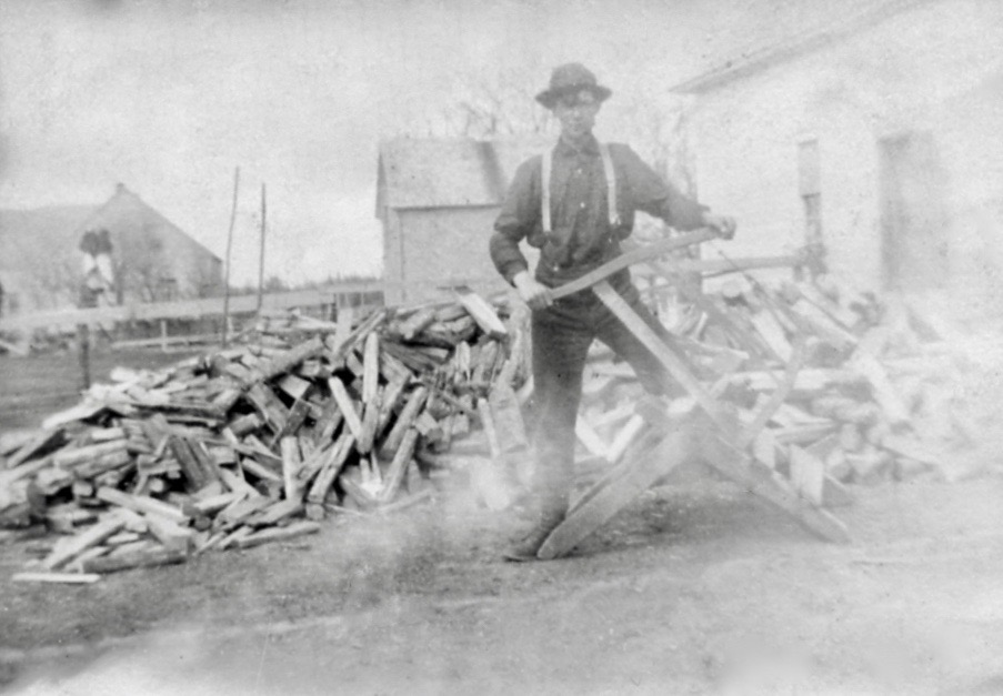 Small photo of a young man cutting wood in a farm yard. It is believed he would be one of the MacPhie or Ballantynes family.