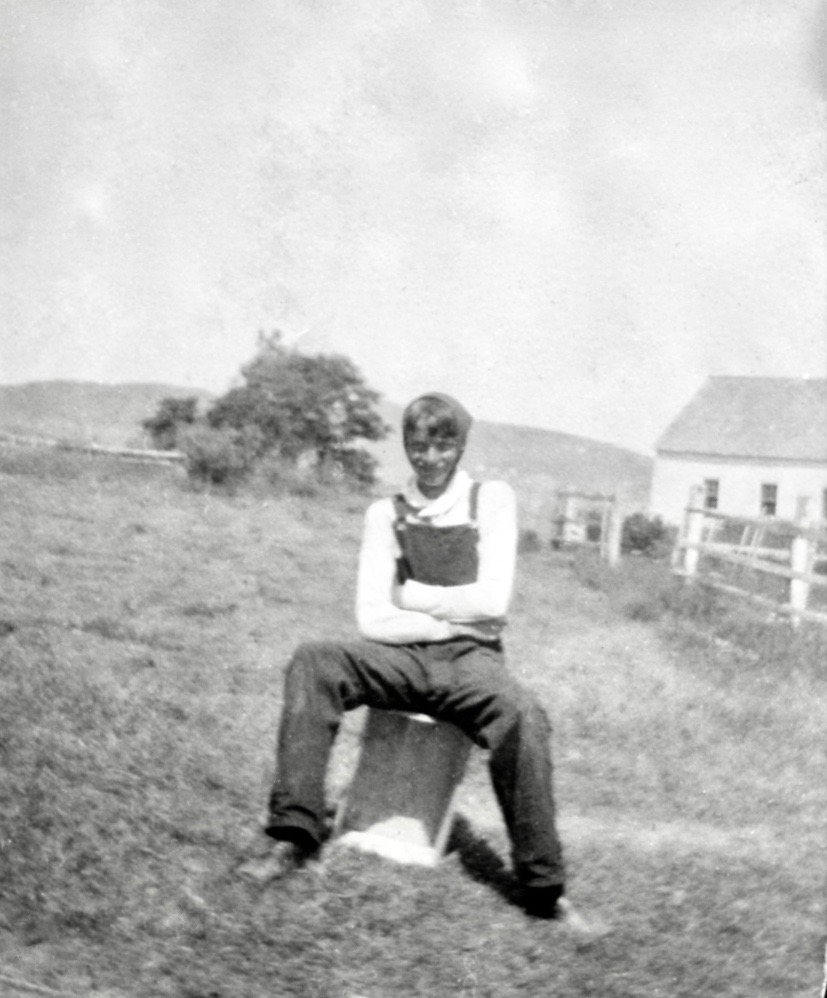 Teen male sitting on a wooden crate in a farm yard. Arms crossed and smile, he appears to be wearing a kerchief. Unknown who he is. Probably a MacPhie or Ballantyne though.