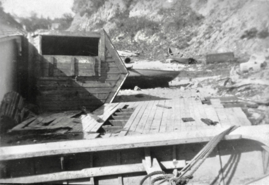 Beach scene of lobster shack on side, debris on beach and a couple of dories. Maybe after a storm?