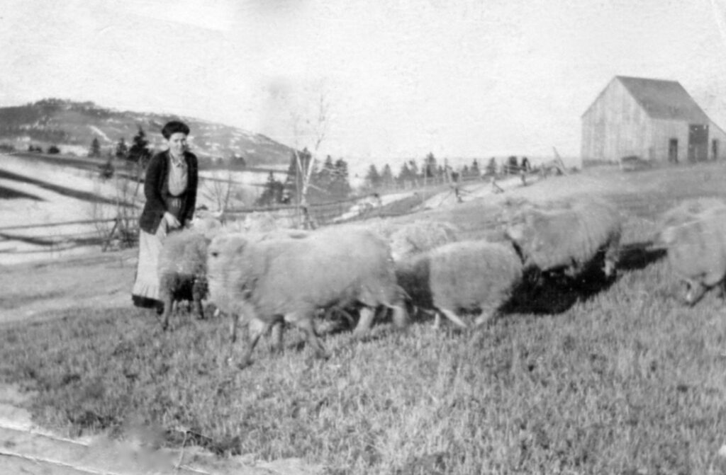 Woman feeding sheep in pasture. Back says “Mum, spring of 1914” Annie Ballantyne/MacPhie
