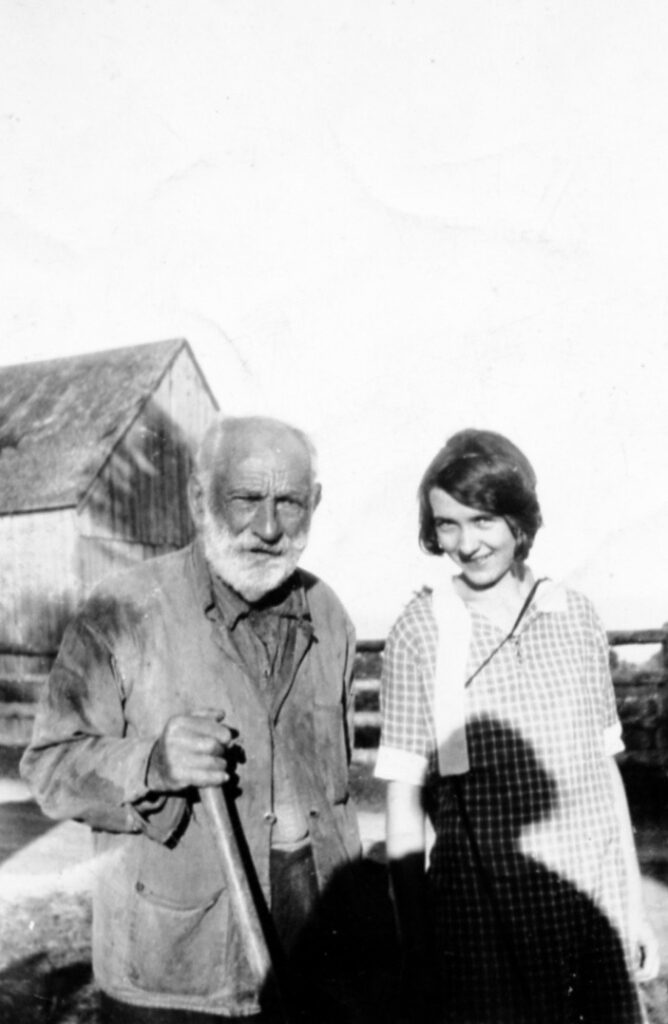 Man and young girl in farm yard. Man is Alex MacPhie and girl is Margaret. Aug 1926