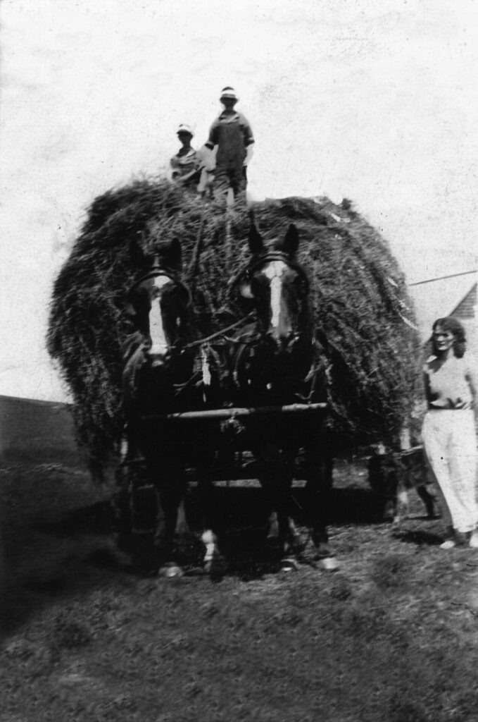 Hay wagon with a woman beside it and two men on top. Woman is Louise MacInnes and Hugh Joseph and Danny MacInnis are on top of it. Would be up at the Point.
