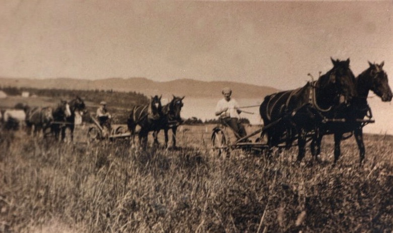 Making hay at the cape. Dan Hughie in front and Herbie MacEachern behind. 1923