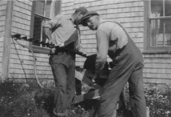 1940 (L to R) Eddie Malcolm MacEachern and Jack Adams sharpening a mowing machine.
